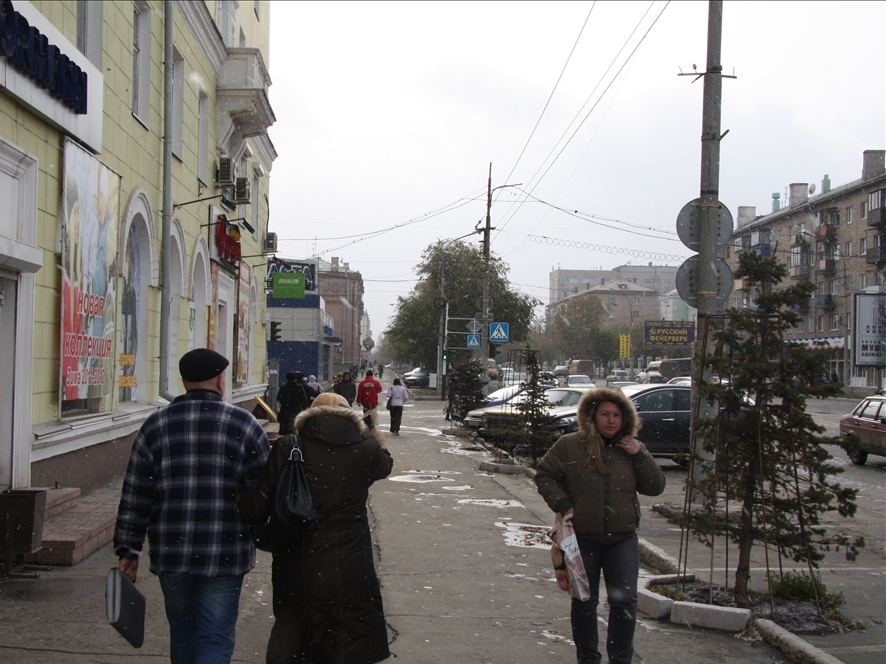 Сегодня в Орске идет снег. Уже сейчас за окном падают мелкие хлопья, и люди прячутся под зонтиками. Снег начинает скапливаться у тротуара, под елочками и на автомобилях.