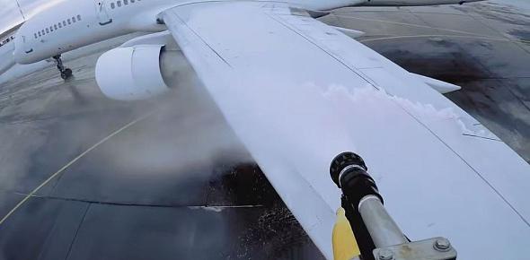 В аэропорту Оренбурга показали, как обрабатываются самолеты против льда зимой перед взлетом